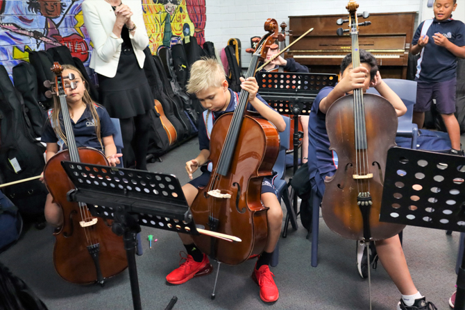 We are uplifted to receive support from the Government House Foundation and sincerely thank everyone who contributed to the gift of 8 cellos for the children. This means that children who have been attending lessons and sharing an instrument will now be able to have their own.” Challis Community Primary School Principal Mrs Lee Musumeci