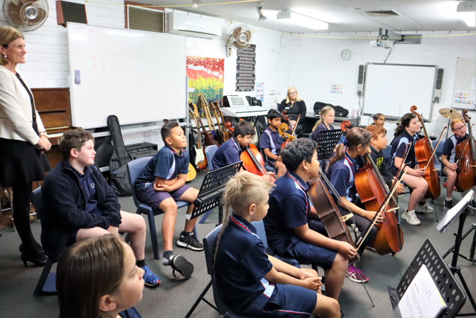 The Governor, accompanied by his wife Ms Susie Annus, and Government House Foundation Artistic Director Ms Fiona Campbell presented the cellos to Challis Community Primary School Principal Mrs Lee Musumeci and music program staff and students on Friday 25th September.